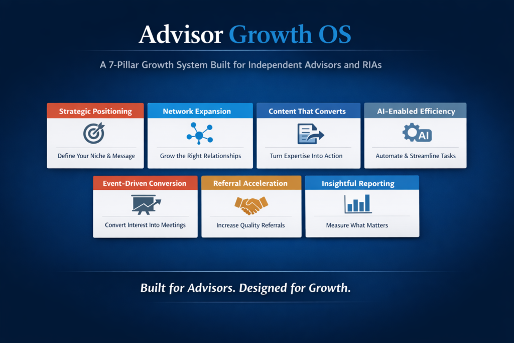 The System for Scalable Advisor Success Most advisors aren’t struggling because they’re not working hard. They’re stuck managing disconnected vendors, tools that don’t talk to each other, and a marketing strategy that feels reactive instead of intentional. Advisor Growth OS changes that. It’s a unified growth system designed for financial advisors and RIAs who are ready to stop guessing and start growing with purpose. At the foundation are the 7 Pillars of Growth. This strategic framework turns visibility into momentum and activity into results.